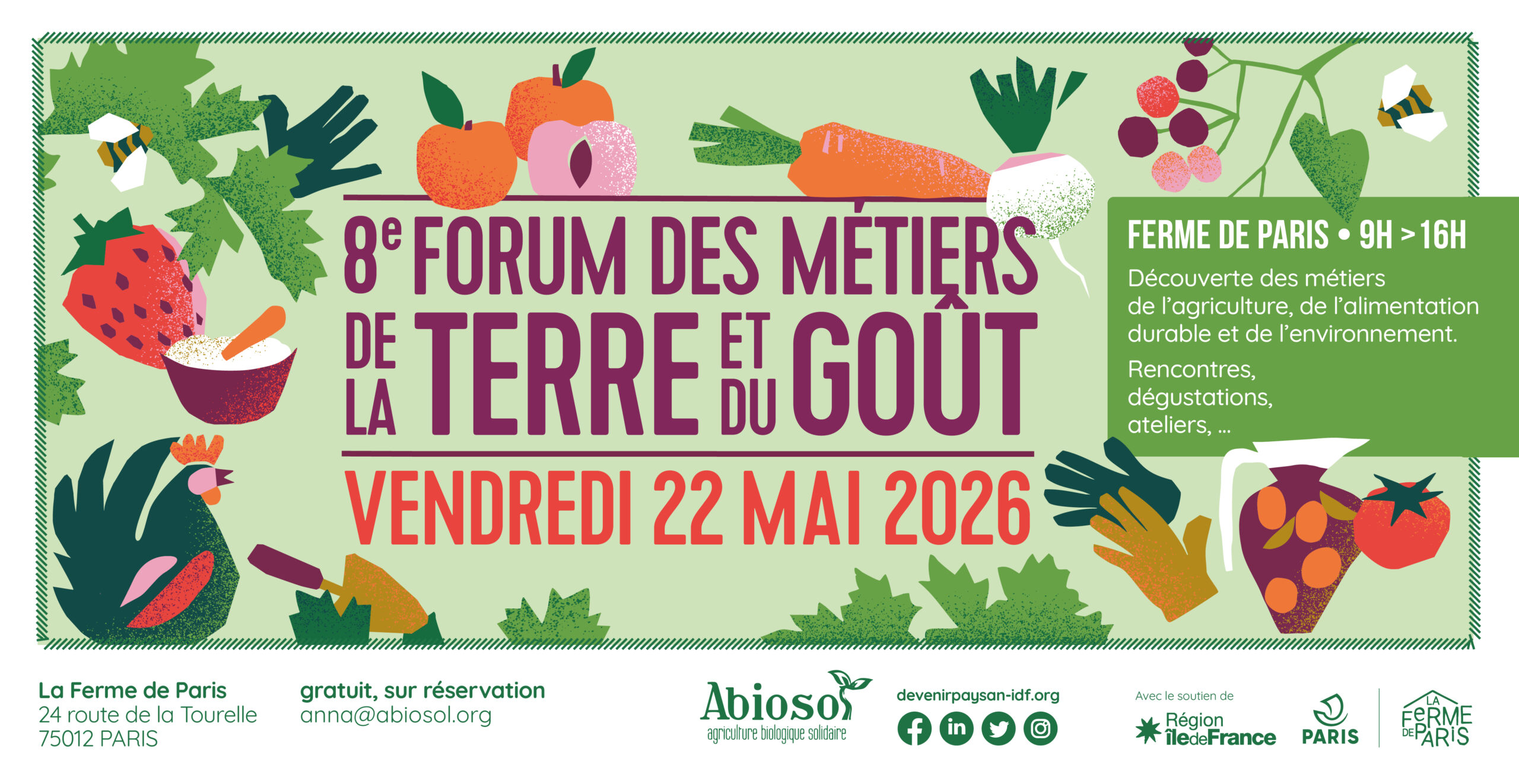 Ce forum itinérant a pour vocation de faire halte dans différentes fermes urbaines et tiers-lieux franciliens afin de sensibiliser les publics urbains au large panel des métiers de la production agricole et de l’artisanat alimentaire. Au programme : des stands découverte, des écoutes de podcasts, des expositions sur l’artisanat alimentaire et l’élevage, des dégustations et des démonstrations. Les exposant.es : des paysan.nes du réseau Abiosol, des transformateur.ices alimentaires impliqué.es dans une démarche vertueuse, des établissements d’enseignement agricole, horticole et culinaire mais aussi des prescripteurs de l’emploi.